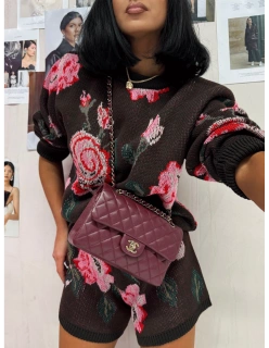 Komplet sweterkowy ze spodenkami w różę - czekoladowy