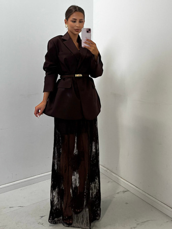 - Elegancka spódnica z koronki o delikatnym, ażurowym wzorze, idealnie podkreśla kobiecą sylwetkę. Krótsza podszewka subtelnie eksponuje nogi, nadając stylizacji lekkości i zmysłowego charakteru.