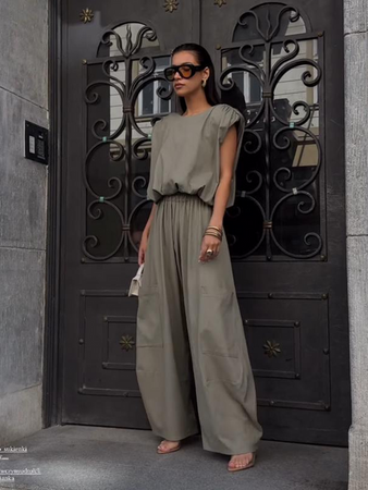 - Stylowy i wygodny komplet idealny na miejskie dni i letnie wyjazdy. Luźny top doskonale układa się na sylwetce, a szerokie spodnie z wysokim stanem i kieszeniami cargo dodają całości nowoczesnego charakteru. Elastyczna talia zapewnia komfort noszenia.