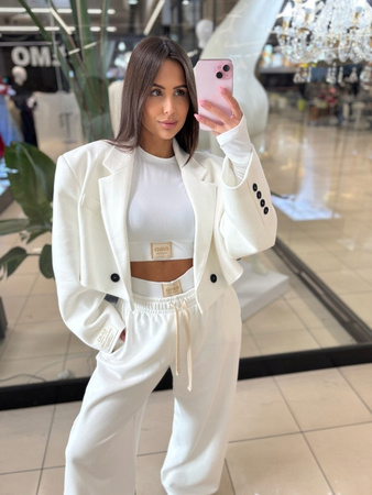 Stylowy komplet damski składający się z prostych spodni dresowych oraz krótkiej marynarki z ozdobną naszywką na rękawie to połączenie elegancji i wygody. Idealny na co dzień lub na casualowe spotkania, zapewnia komfort i modny wygląd w każdej sytuacji.