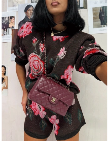 Komplet sweterkowy ze spodenkami w różę - czekoladowy