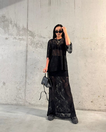 - Czarna długa koronkowa spódnica La Milla wykonana z wysokiej jakości koronki z delikatnym wzorem kwiatowym. Wewnętrzna podszewka sięga do połowy uda, zapewniając komfort noszenia. Elastyczny pas gwarantuje wygodne dopasowanie do sylwetki, podkreślając je