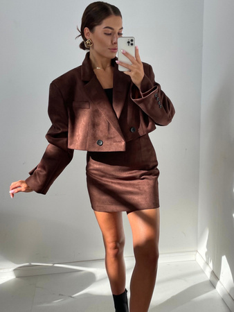 - Zamszowa marynarka to elegancka i ponadczasowa propozycja, idealna na chłodniejsze dni. Do kompletu można dokupić dopasowaną spódniczkę, tworząc stylowy i harmonijny zestaw.