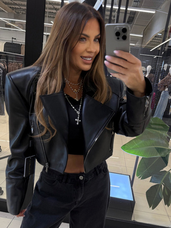 - Krótka kurtka z naturalnej skóry to wyrazisty element garderoby. Wbudowane poduszki dodają jej charakteru i podkreślają sylwetkę, a długi rękaw nadaje całości eleganckiego, a zarazem odważnego wyrazu.