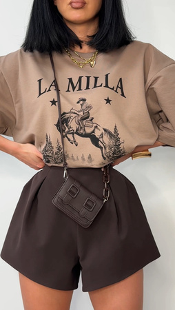 - Czekoladowe spodenki La Milla o unikalnym kroju typu „bombki” to stylowy i wygodny element garderoby. Krótsze z przodu i delikatnie dłuższe z tyłu, pięknie układają się na sylwetce, tworząc efekt lekko rozkloszowaneg