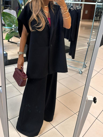 - Czarne spodnie oversize z miękkiego, elastycznego materiału charakteryzują się komfortową gumką w pasie, która idealnie dopasowuje się do sylwetki, zapewniając wygodę noszenia. Długie, luźne nogawki nadają im swobodny, nowoczesny wygląd.