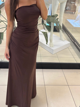 - Długa sukienka typu tuba bez ramiączek zachwyca elegancją i kobiecym fasonem, a marszczenia po bokach subtelnie podkreślają sylwetkę. Rozszerzany dół zapewnia swobodę ruchów i komfort noszenia, idealny na wyjątkowe okazje.