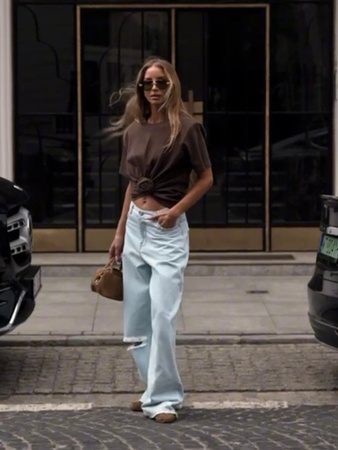 - Krótka bluzka o dopasowanym kroju, z ozdobną, materiałową różą na przodzie oraz poduszkami na ramionach. Idealna na wiosenne i letnie dni, łącząca elegancję z nowoczesnym akcentem.