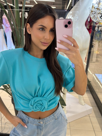 - Krótka bluzka o dopasowanym kroju, z ozdobną, materiałową różą na przodzie oraz poduszkami na ramionach. Idealna na wiosenne i letnie dni, łącząca elegancję z nowoczesnym akcentem.