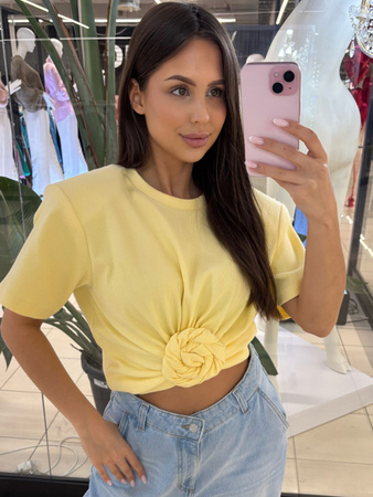 • Krótka bluzka o dopasowanym kroju, z ozdobną, materiałową różą na przodzie oraz poduszkami na ramionach. Idealna na wiosenne i letnie dni, łącząca elegancję z nowoczesnym akcentem.